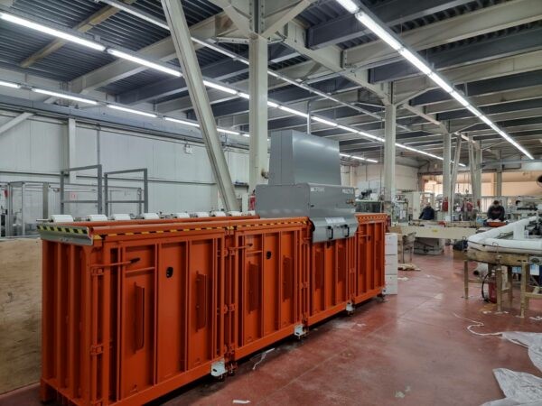 Fabrikken kildesorterer papiravskjær fra produksjonen i en standard MULTI-dobbeltkammer emballasjepresse. I takt med voksende virksomhet måtte bedriften øke kapasiteten på komprimeringen, og oppgraderte emballasjepressen fra en 2-kammer til en 4-kammer løsning.