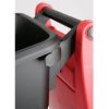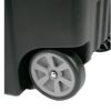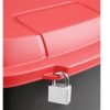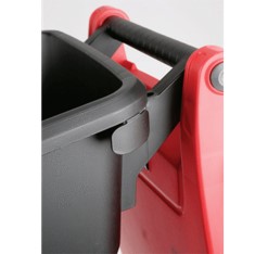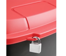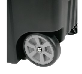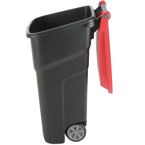 2-hjuls plastbeholder på 100 liter med ekstra stor åpning, låsøye for hengelås og med solide gummihjul. Enkel tømming med integrert sekkeholder.