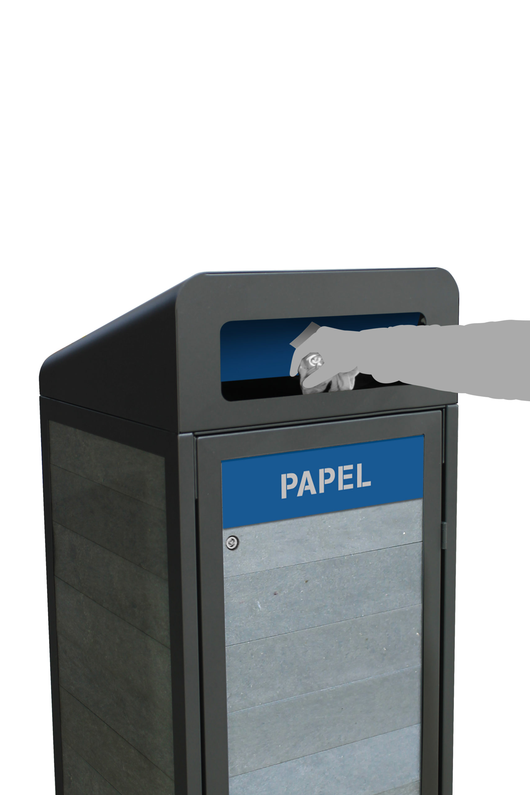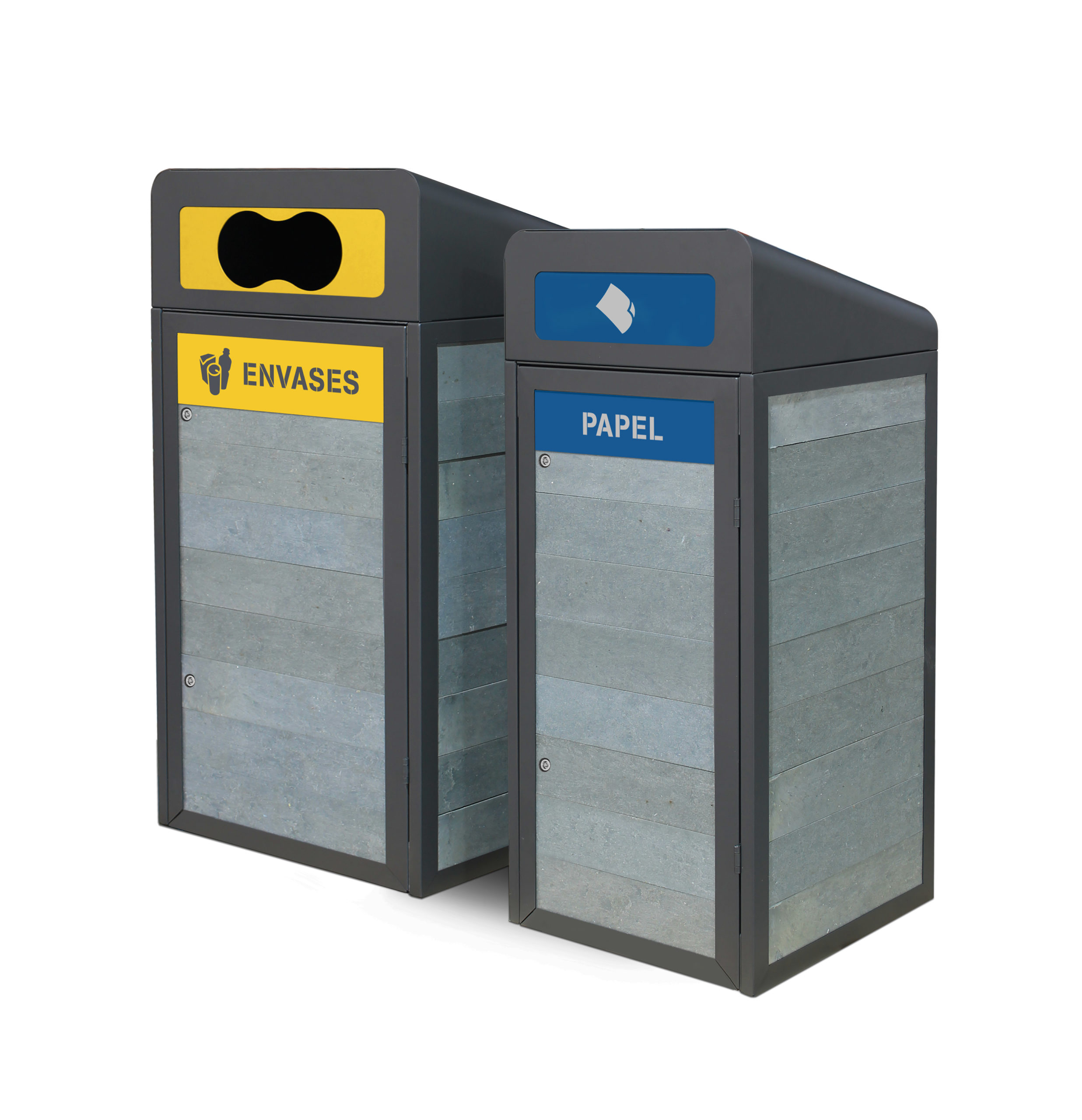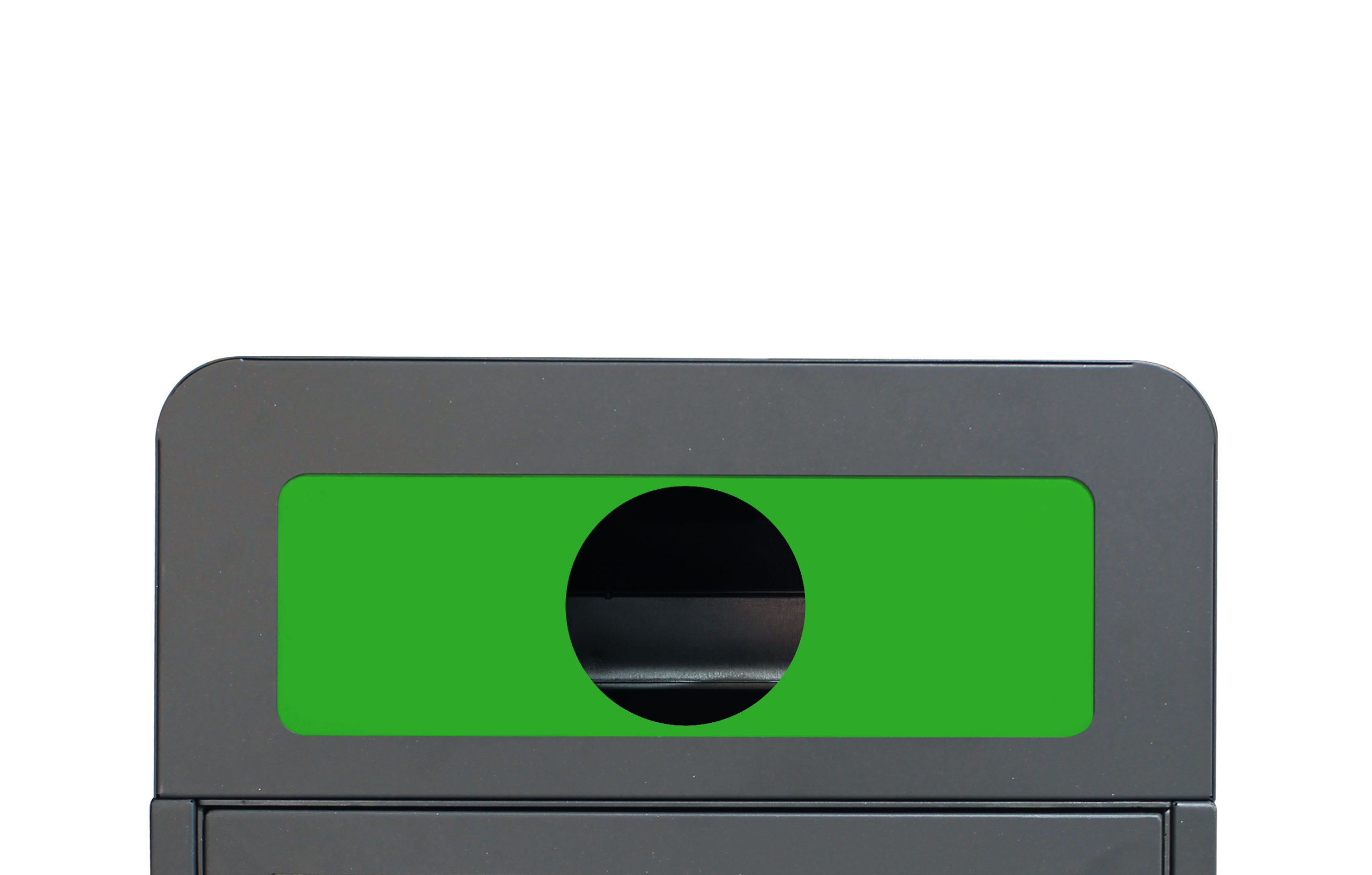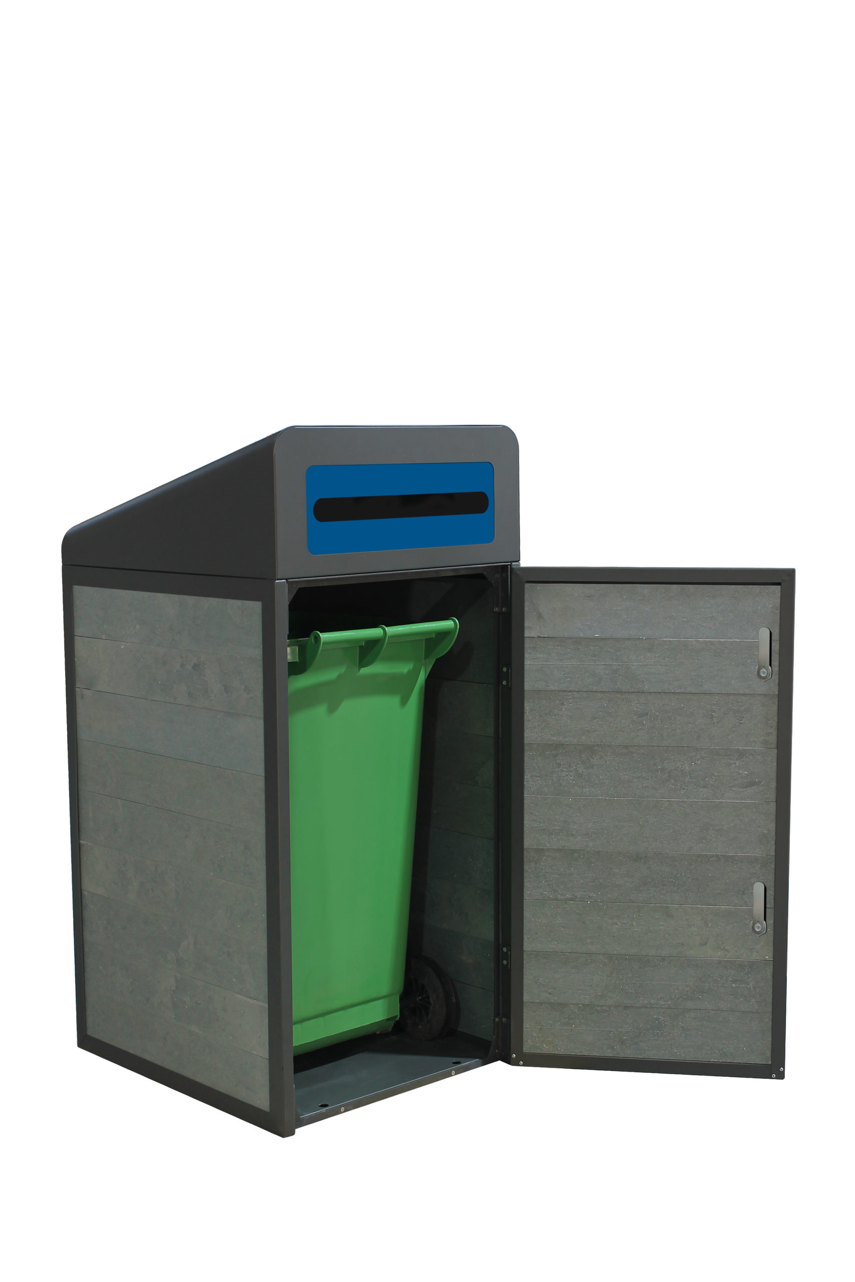 Zürich avfallsskjuler er produsert med paneler (25 mm tykkelse) som består av 70 % resirkulert plast. Konstruksjon med fugeelementer er i galvanisert stål (1,5/3 mm tykkelse). Velg om dør skal plasseres i fromt eller på bakside. Kan leveres m/ lås på dør.