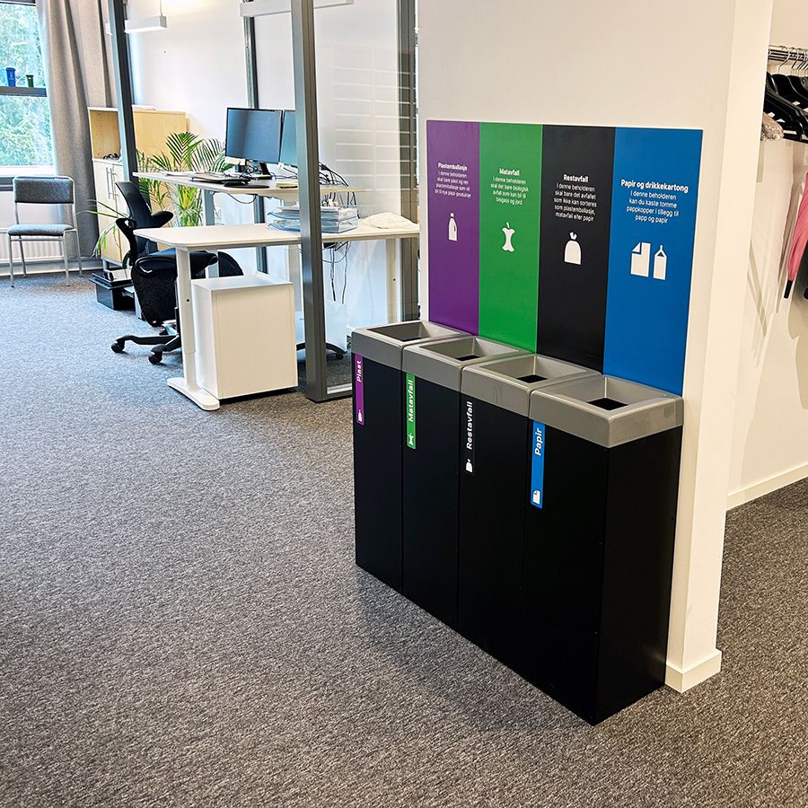 Sorteringsmerker etter nasjonal merkeordning, både på beholder og veggen bak er tilgjengelig, Se under.