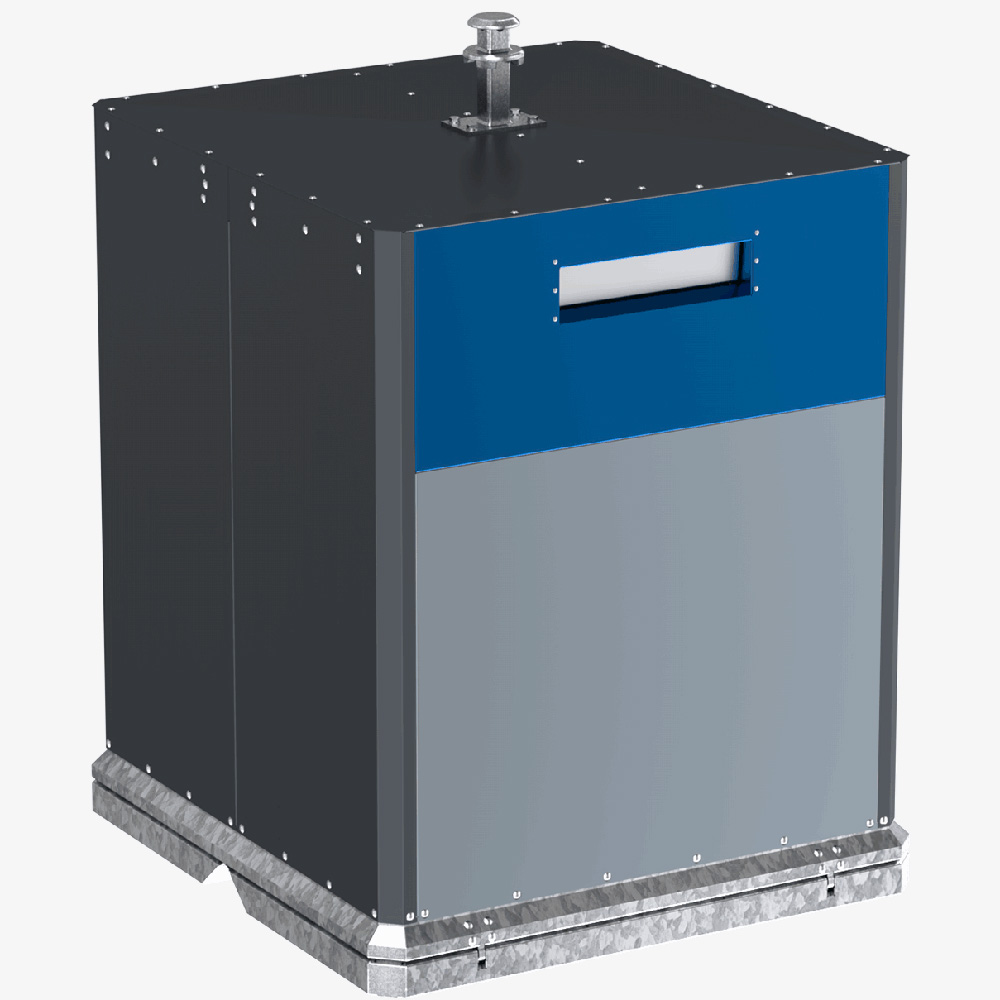 Beholder front/bak RAL 7001, sider/topp RAL 7015. Innkast for følgende avfallstyper: Restavfall / Papir / Emballasje / Glass / Ekspanderende materiale.