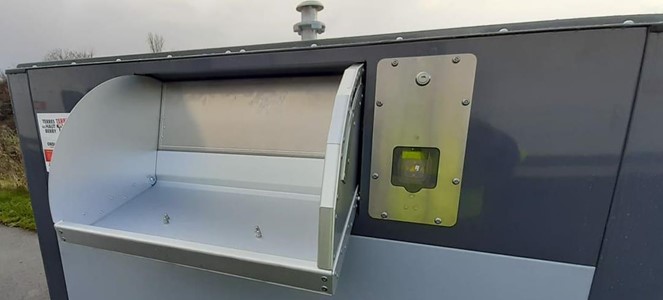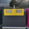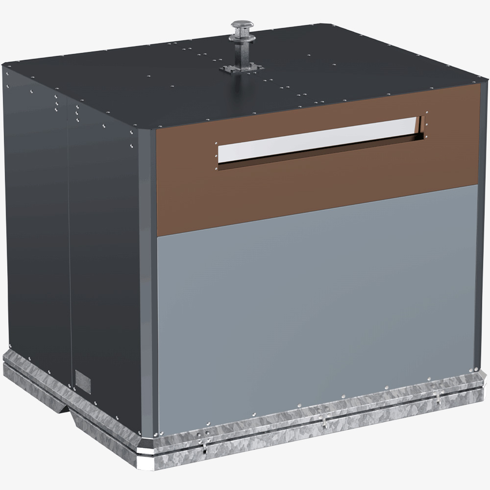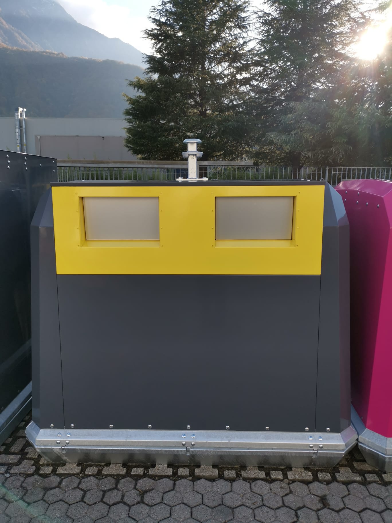 Beholder front/bak RAL 7001, sider/topp RAL 7015. Innkast for følgende avfallstyper: Restavfall / Papir / Emballasje / Glass / Ekspanderende materiale.