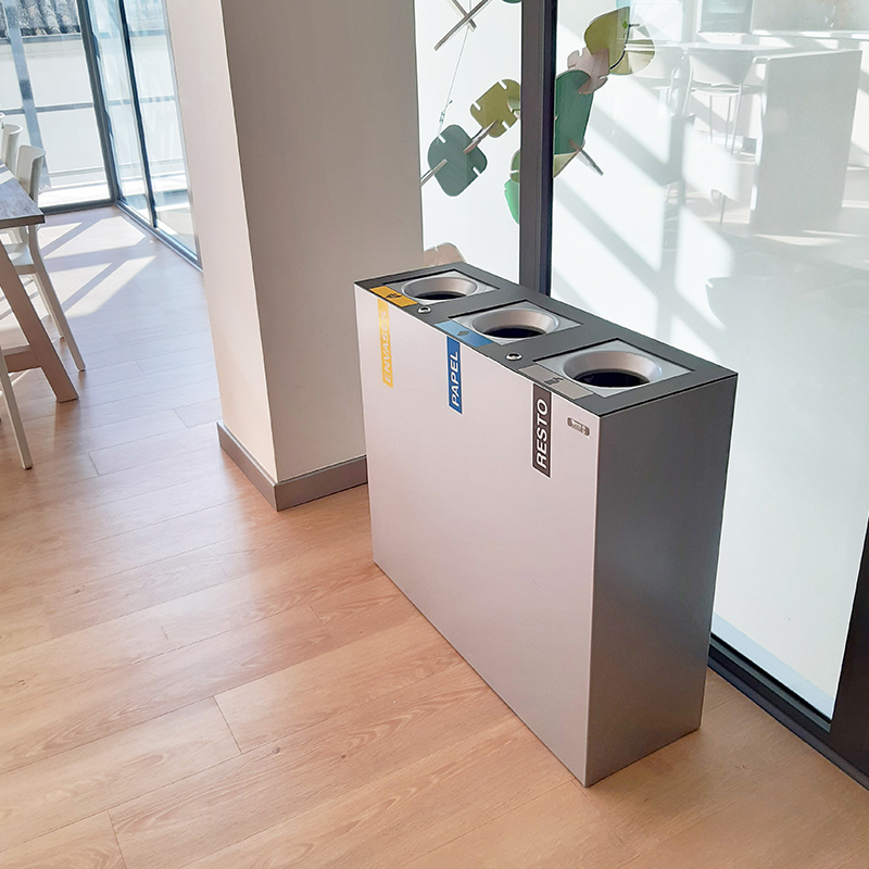 Innvendig er beholderen utstyrt med enten sekkeholder eller stålbeholder.