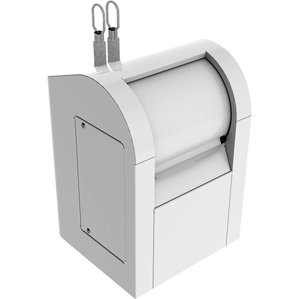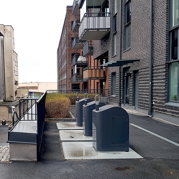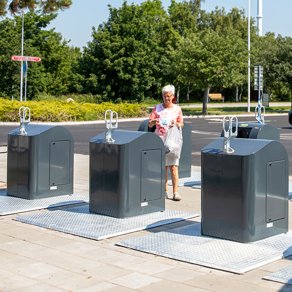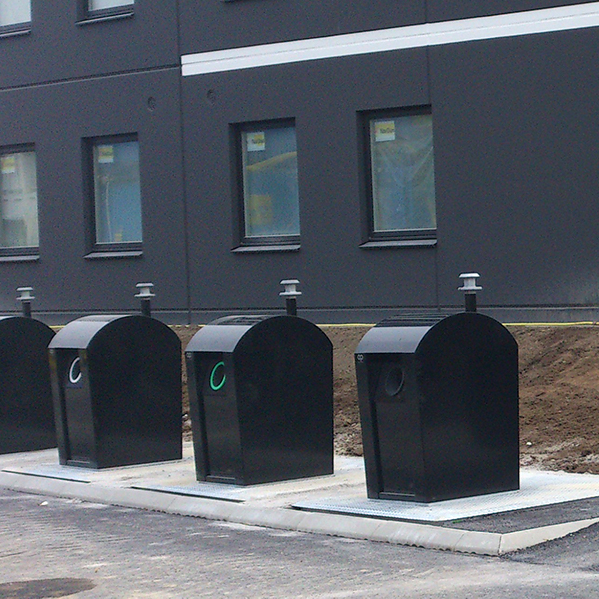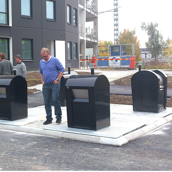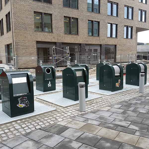 Containeren er støyisolert og føres i 3-4-5 m3. Er utstyrt med bunnklaffer og i bunn finnes en anordning av sigevæske. Ved tømming løftes både innkasthus med plattform opp ved hjelp av kranbil - Gangplattform