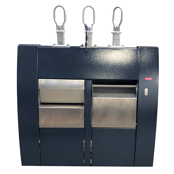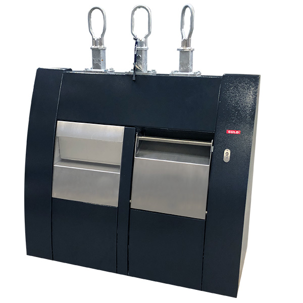 SULO Iceberg Max3 Twin modell har en total kapasitet på 5 m3, fordelt på to kammer som vist på bilde. Innvendig beholder er delt i to med separate bunnluker. Ved tømming løftes innvendig beholder med kranbil. Hver bunnluke betjenes manuelt og tømmes hver for seg. Type innkast som leveres er skuffe – slisse – glass.