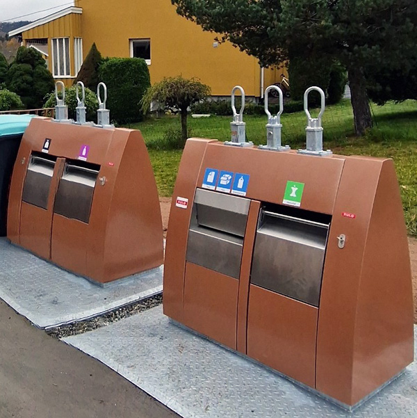 Containeren er støyisolert og føres i str. 3-4-5 m3. Er utstyrt med bunnklaffer og i bunn finnes en anordning av sigevæske. Ved tømming løftes både innkasthus med plattform opp ved hjelp av kranbil - Gangplattform
