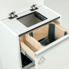 Skuffene er utstyrt med kulelager for enkelt uttrekk. Innkaståpning under lokket er 270x195mm, av kompaktlaminat – for best mulig  hygiene.