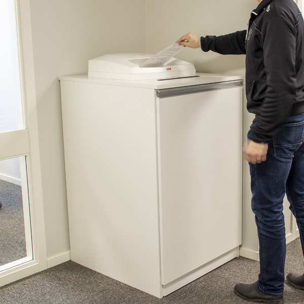 Sorter konfidensielle papirer på kontoret. Med vårt kildesorteringsmøbel med en fastmontert makuleringsmaskin av høyeste kvalitet har du en smidig løsning.