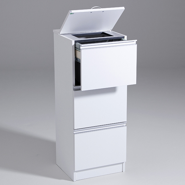 Et stilrent og kompakt kildesorteringsmøbel som passer inn de fleste steder.