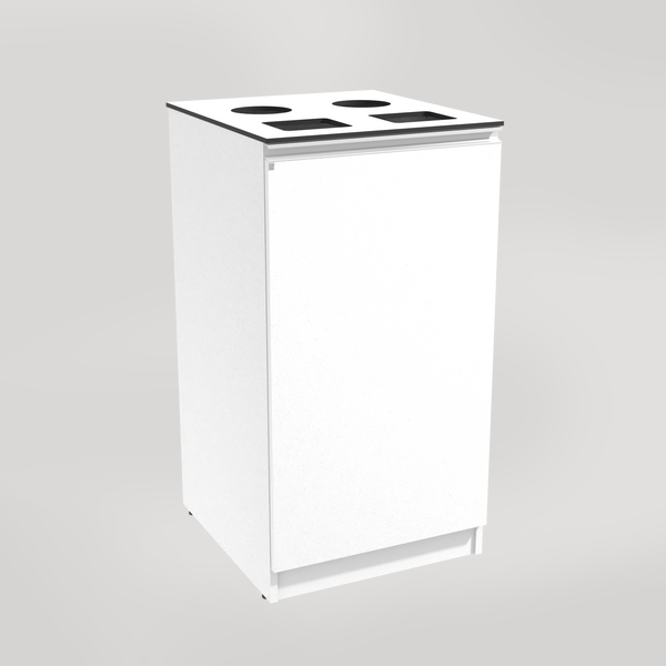 Avfallsskap for 4 avfallstyper. 2 runde hull og 2 rektangulære hull i topplokket. Avfallet havner i 2 stk. 25 liters beholdere (SS8525-40) og 2 stk. 60 liters beholdere (SS67-049600). Beholderne er inkludert. Med god merking er det enkelt å sortere riktig (se våre Sorteringsmerker).