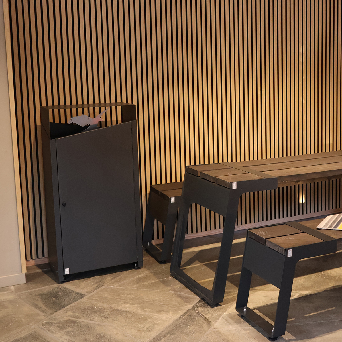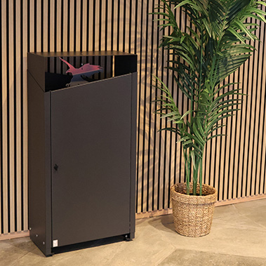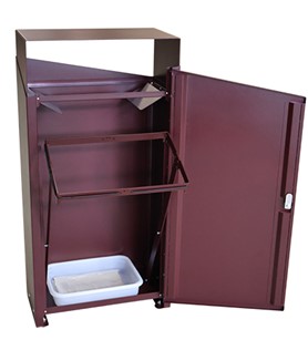 Beholderen rommer mye avfall. Den er enkel å tømme. Leveres ferdig montert. Avfallsbeholderen har en innvendig vippbart sekkestativ til standard 100 l plastsekk, og en plastbakke i bunn for oppsamling av lekkasjer fra plastposer. Døren har en sold lås med låsevrider.