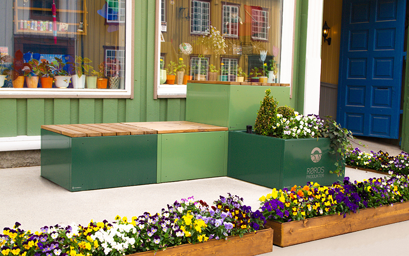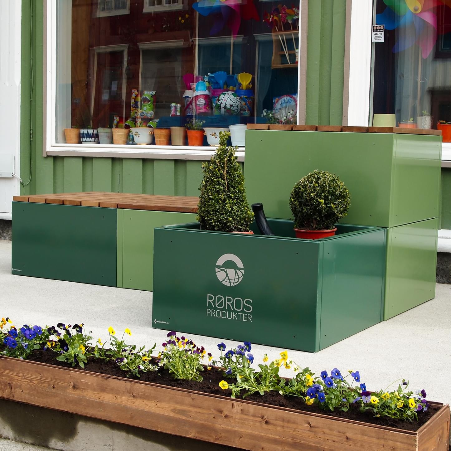 Modul benker og plantekasse har en solid konstruksjon som passer godt i det offentlige rom. Laget i pulverlakkert rustfritt stål. Lakkeres i valgfri RAL farger fra vårt standard fargekart.