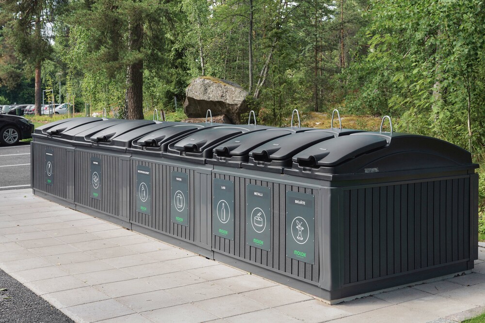 Molok Domino avfallsbeholder 3 m3 kan samle inn 1-4 forskjellige avfallstyper i en og samme beholder. Ytterbeholder i fiberarmert betong.