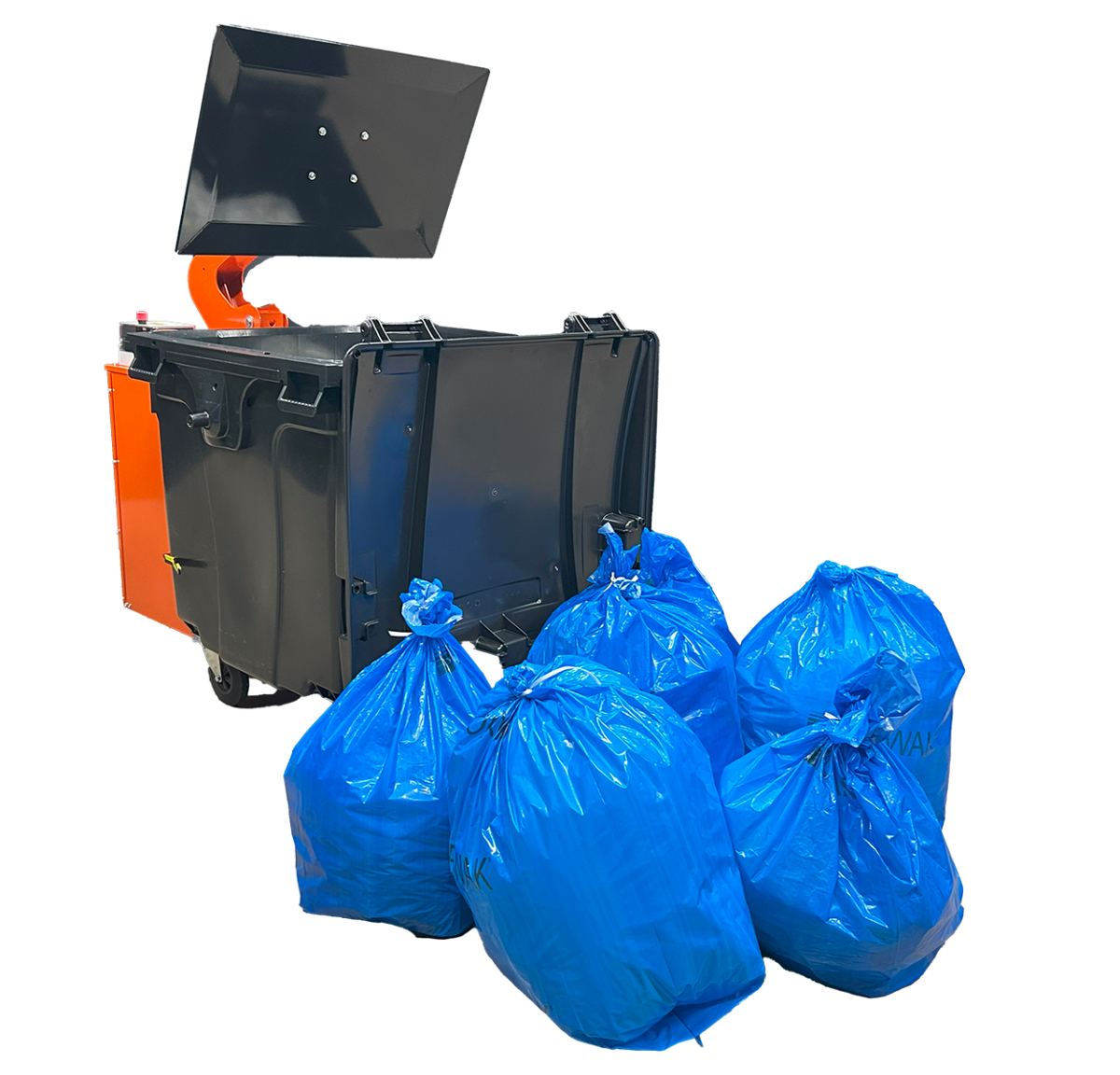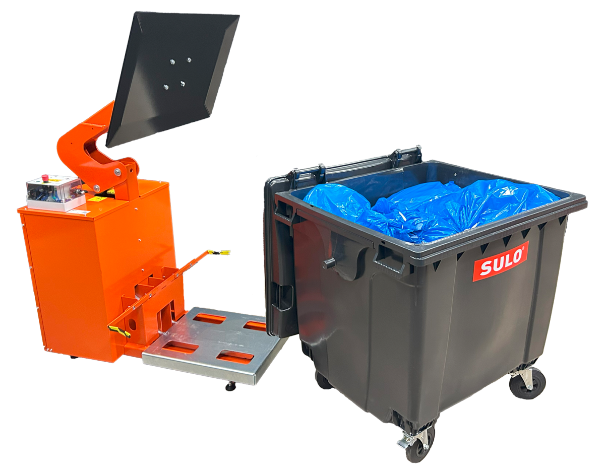 Komprimerer direkte i avfallsbeholder. Tilpasset standard 1000/1100 liters beholder. Kompakt og arealeffektiv.