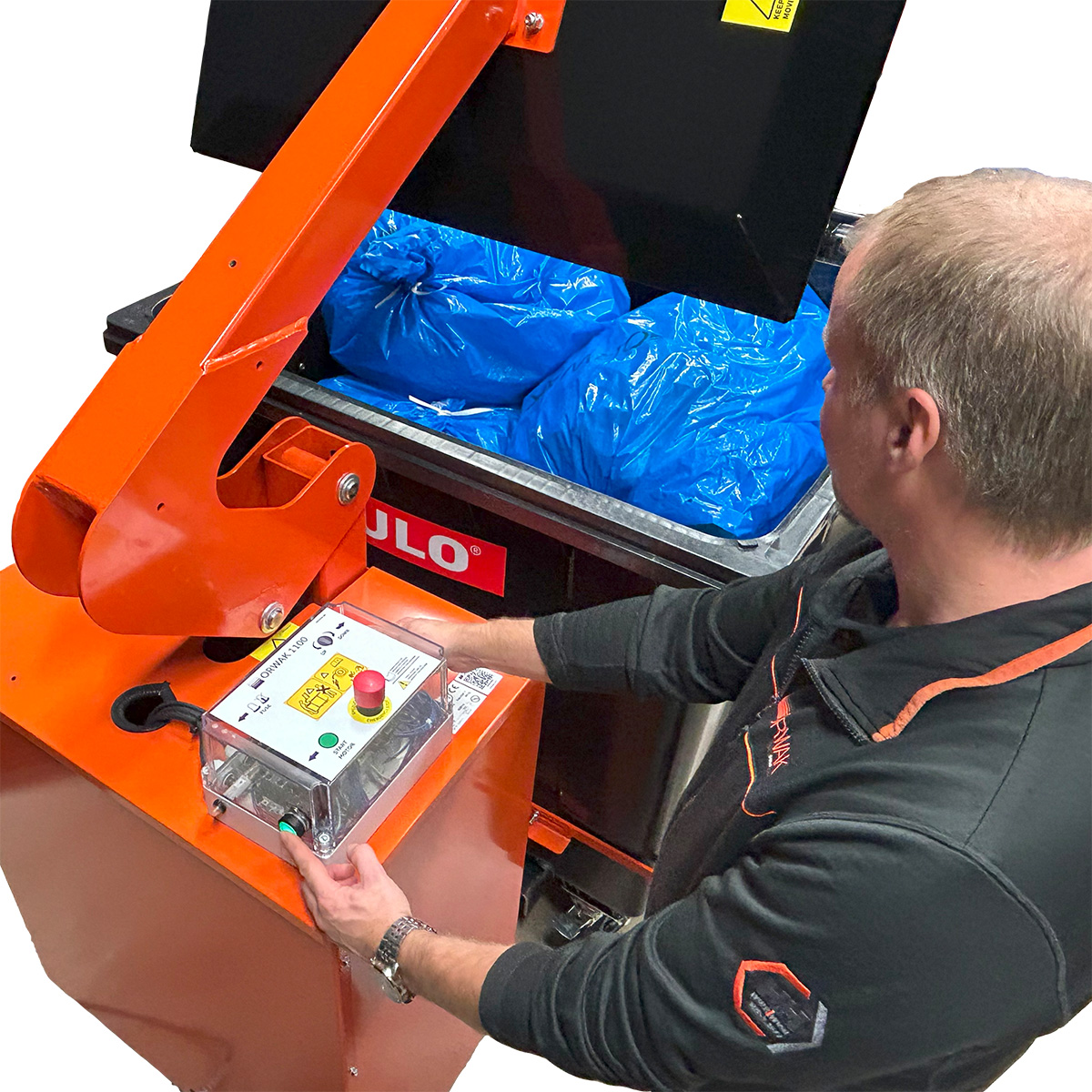 Orwak Flex 1100 emballasjepresse er optimert for avfallsbeholder på 1000/1100 liter, og er basert på et enkelt «roll in, roll out»-konsept Løsningen er perfekt for komprimering av restavfall i sekker. FLEX 1100 kan enkelt justeres slik at den passer til alle typer avfallsbeholdere, og den er sikker og enkel i bruke. Den har en praktisk og kompakt utforming, og trenger ikke mer enn 1m2 gulvplass. Helårsolje er standard.