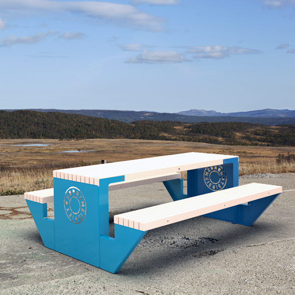 Rast har en solid konstruksjon og passer godt inn i det offentlige rom. Produsert i lakkert stål og vist her med treverk i malmfuru. Andre farger og annet treverk kan også leveres mot et pristillegg. Rast kan også leveres med utskåret logo som dere ser vist på bilde med blå utgave.