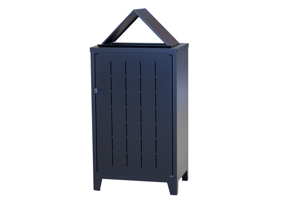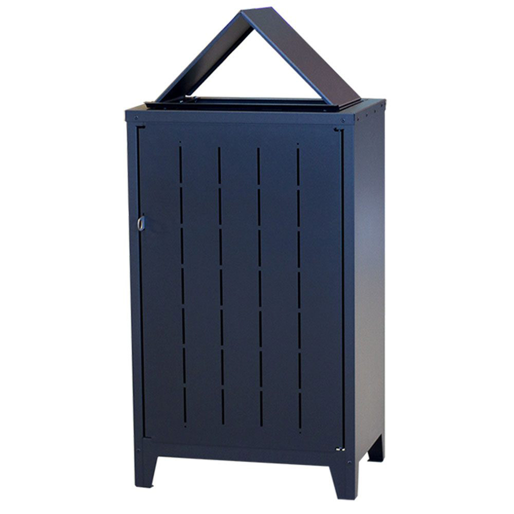 Robust utendørs avfallsbeholder i lakkert stål med låsebrakett på dør. Til 100-125 liters sekker.