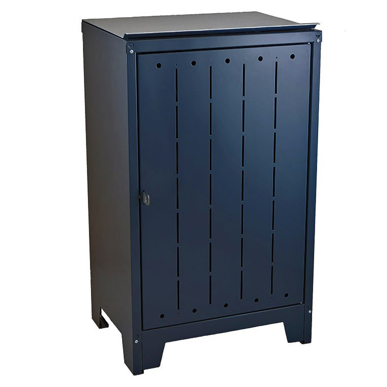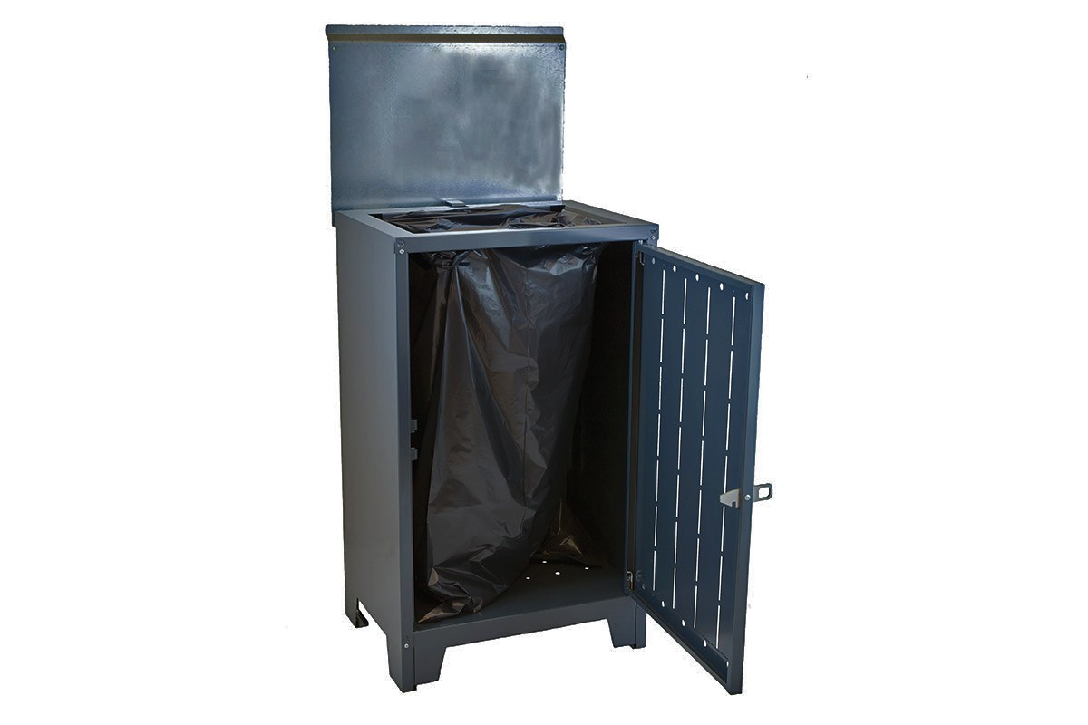 Robust utendørs avfallsbeholder i lakkert stål med låsebrakett på dør. Til 100-125 liters sekker.