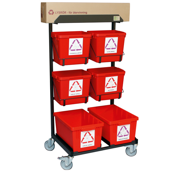 Lakkert sorteringsvogn leveres komplett. Systemet er funksjonelt både med hensyn til renhold og henting/ tømming av avfallet. Løsningen er mye brukt for innsamling av elektrisk- og batteriavfall. Trallen tar minimalt med plass og er ypperlig for faghandel, bensinstasjoner, storkiosker med flere som har minimalt med plass til avfallshåndteringen.