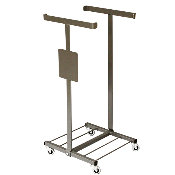 T-stativ med fjæring i øvre del. Fraksjonsskilt er integrert i stativet. Gummihjul med dm 50mm. Stativet er i pulverlakkert stål og fargen er grå.