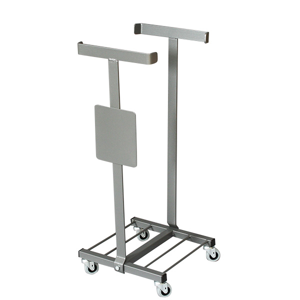 T-stativ med fjæring i øvre del. Fraksjonsskilt er integrert i stativet. Gummihjul med dm 50mm. Stativet er i pulverlakkert stål og fargen er grå.