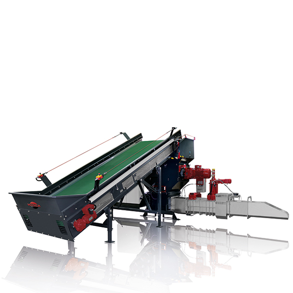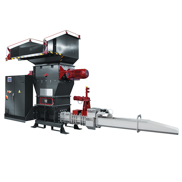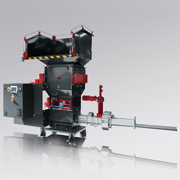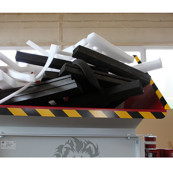 Operatøren legger skumplasten i maskinens trakt for innmating. En effektiv grovkværn med to-tanns roterende aksler reduserer delene ned til biter i str. 20-50 mm. Disse føres inn i trykkanalen der de presses sammen av en trykk-forsterker. Blokkene kommer ut separat og ved hjelp av en automatisk oppdelingsfunksjon lastes de enkelt opp på paller.
