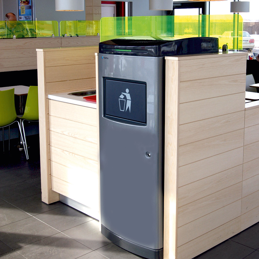 TOM sparer tid, plass og energi, og den sparer utgifter til avfallshåndteringen. Den rommer inntil 7 x mer avfall sammenlignet med en vanlig avfallsbeholder. Avfallsbeholderen er utstyrt med bevegelsessensor som registrerer når noen nærmer seg og luken åpnes automatisk. Luken kan programmeres til å være åpen i perioder med mye trafikk.