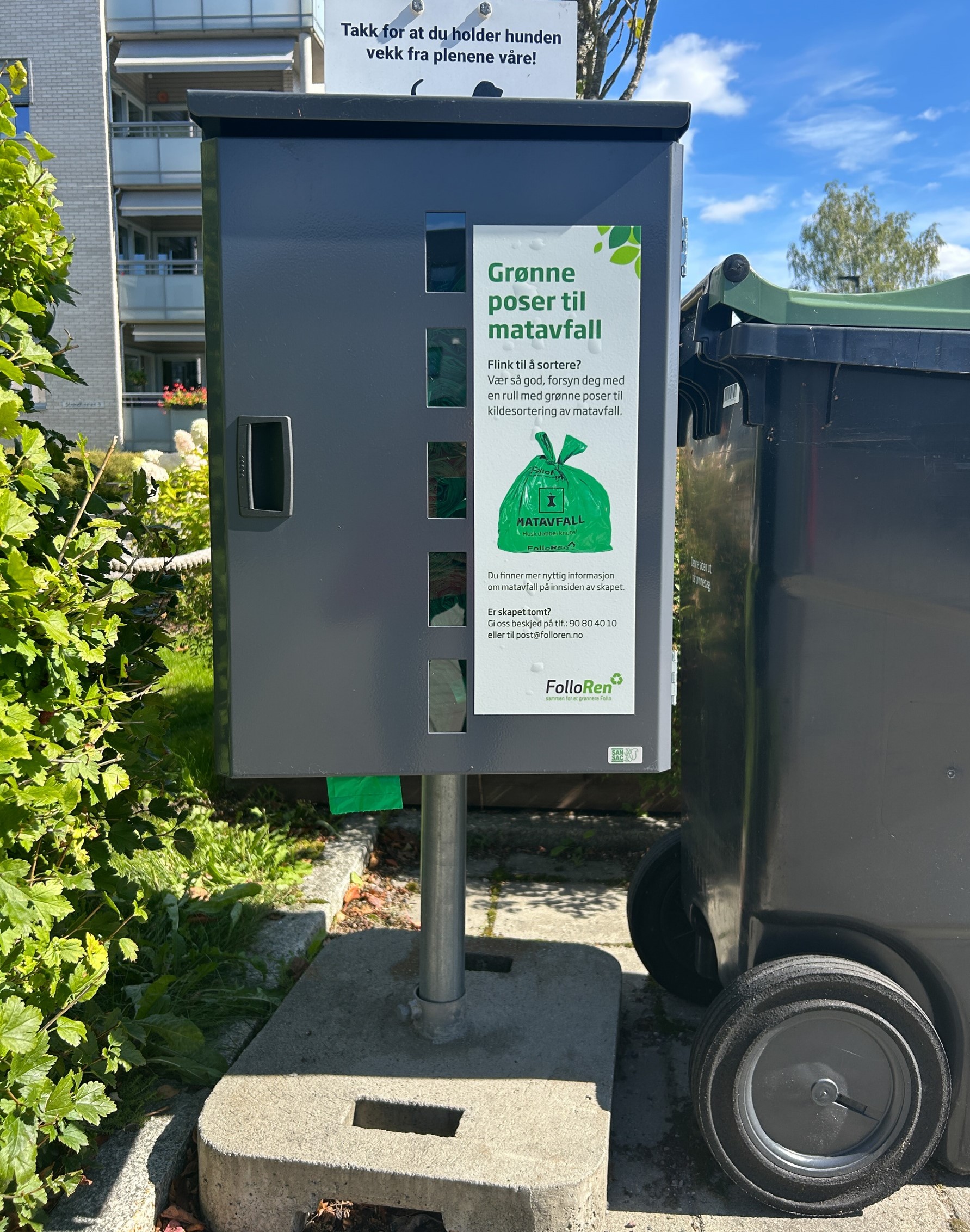 Skap til oppbevaring og distribusjon av matavfallsposer for borettslag.
